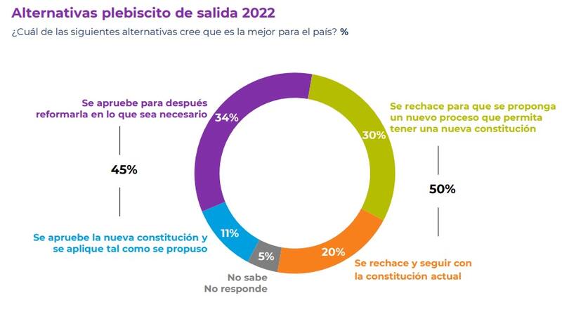 En otro aspecto, el sondeo de opinión reveló que el 11% cree que lo mejor para Chile es que la propuesta de nueva Constitución se apruebe tal como se presente, mientras que el 34% se inclinó por que se apruebe y después se reforme. Asimismo, un 20% optó por que el texto se rechace y se mantenga la actual Carta Magna, y finalmente un 30% cree que debe rechazarse para que se proponga un nuevo proceso.