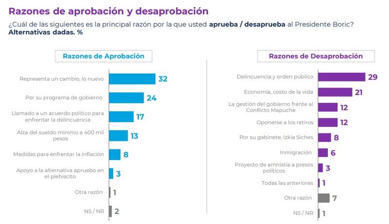 Respecto a lo anterior, los principales motivos para aprobar su gestión son que representa un cambio (32%), por su programa de gobierno (24%) y por el llamado a un acuerdo político para enfrentar la delincuencia (17%). En tanto, las principales razones para desaprobarlo son la delincuencia y el orden público (29%), además de la economía y el costo de la vida (21%), y la gestión del gobierno frente al conflicto Mapuche (12%).