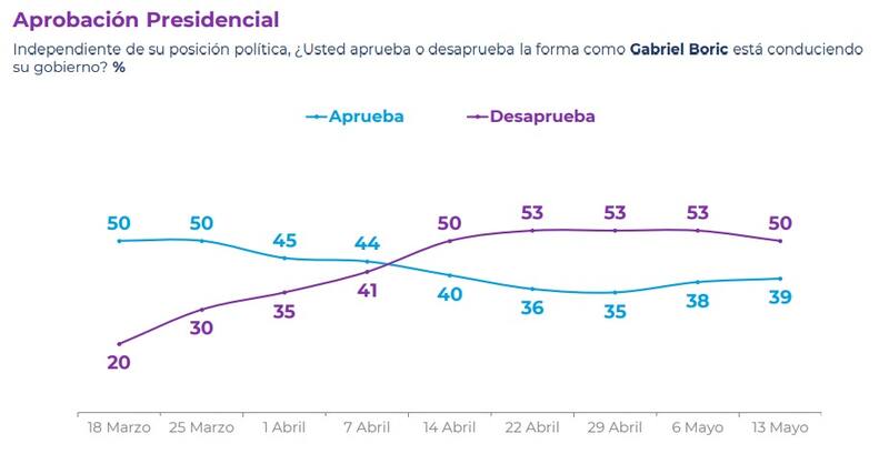 En otro aspecto, la aprobación a la gestión del Presidente Gabriel Boric también consignó un ligero incremento, de sólo un punto porcentual (39%), mientras que su desaprobación bajó de 53% a 50%.