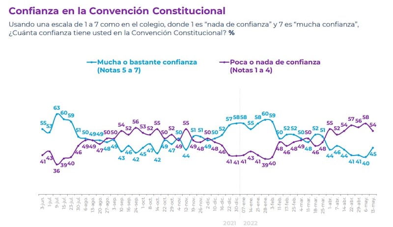 A la vez, la confianza en la Convención Constitucional aumentó por primera vez en las últimas cuatro semanas, registrando un alza de 5 puntos desde el sondeo anterior, alcanzando un 45%. Asimismo, la desconfianza en el órgano redactor cayó de 58% a 54%.