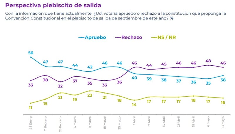 Este domingo se conocieron los resultados de la encuesta Plaza Pública Cadem, correspondiente a la segunda semana de mayo, la cual reveló que, después de seis semanas a la baja, la intención de votar Apruebo en el plebiscito del próximo 4 de septiembre evidenció una leve alza de 3 puntos porcentuales, llegando al 38%.
