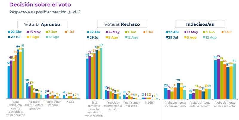 Entre quienes votarían Apruebo, el 91% (+6pts) está completamente decidido a votar así, mientras que en el caso de los que votarían Rechazo, el 92% (+5pts) está totalmente decidido. Una tendencia que resalta en la encuesta es que el 64% de los indecisos probablemente no concurrirán a votar, pese a que en esta ocasión es obligatorio hacerlo.