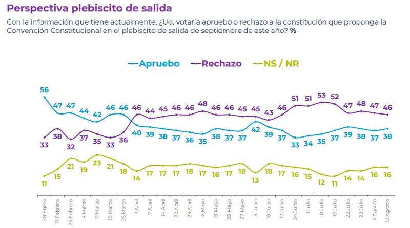 La tarde de este domingo se conocieron los resultados de la encuesta Plaza Pública Cadem, correspondiente a la segunda semana de agosto, los cuales revelaron que la intención de votar Apruebo, de cara al plebiscito del 4 de septiembre, evidenció una mínima alza de un punto, quedado en 38%, mientras que el Rechazo cayó en un punto, llegando al 46%.