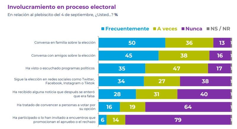 En tanto, el 50% asegura que ha conversado con su familia frecuentemente sobre la elección, el 45% lo ha hablado con sus amigos, el 34% suele seguir el proceso en redes sociales y 28% declara que con frecuencia ve noticias falsas. Asimismo, el 79% nunca ha participado en encuentros que promocionan alguna de las dos preferencias.