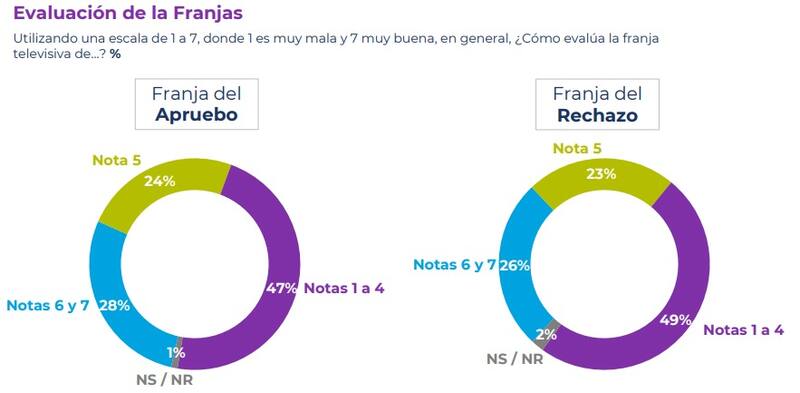 Respecto a la franja electoral que se transmite por los canales de televisión, el 65% la ha visto, de los cuales el 28% evalúa positivamente la del Apruebo y 26% la del Rechazo.