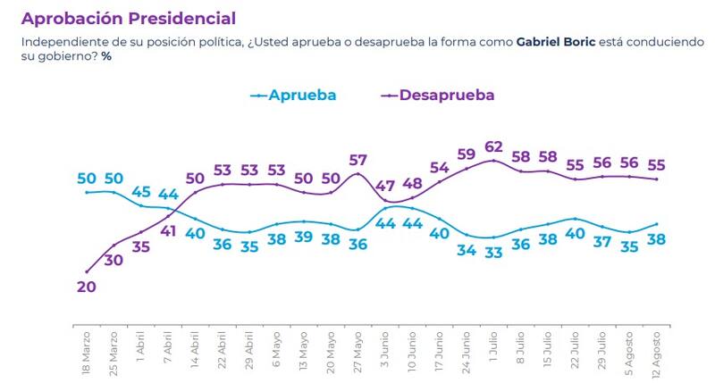 A tres semanas del plebiscito, la distancia entre ambas opciones se vuelve a estrechar, considerando que en las últimas dos semanas la diferencia se había mantenido en diez puntos porcentuales. Además, el sondeo de opinión consignó un repunte en la aprobación a la gestión del Presidente Gabriel Boric, llegando al 38%.