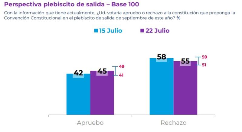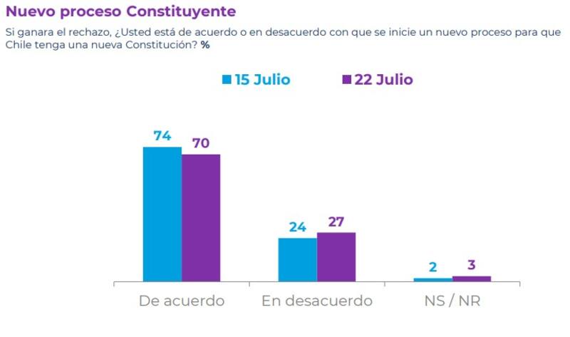 En la tercera semana de julio, el sondeo de opinión reveló además que el 70% considera que de ganar el Rechazo se debe realizar otro proceso para que Chile tenga una nueva Constitución, mientras que el 27% está en desacuerdo con esta opción. En tanto, por tercera semana consecutiva, se registró un aumento en la aprobación a la gestión del Presidente Boric.