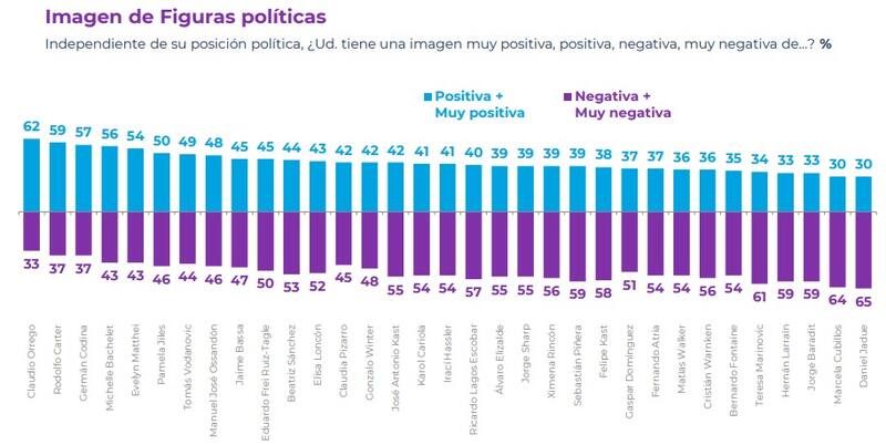 Finalmente, respecto a las figuras políticas mejor evaluadas, el gobernador de la Región Metropolitana, Claudio Orrego, lidera el ranking con el 62%. A él lo sigue el alcalde de La Florida, Rodolfo Carter (59%), el jefe comunal de Puente Alto, Germán Codina (57%), la ex Presidenta Michelle Bachelet (56%) y la alcaldesa de Providencia, Evelyn Matthei, quien pese a obtener un 54% de aprobación, evidenció un desplome de 7 puntos porcentuales respecto al mes de junio.