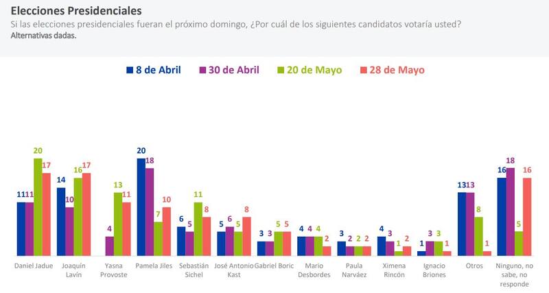 Ambos alcaldes marcaron un 17% de intención de voto. La presidenta del Senado en tanto marcó 11%. Además, la encuesta muestra un reflote del apoyo a la diputada Pamela Jiles, y un aumento del porcentaje para José Antonio Kast.