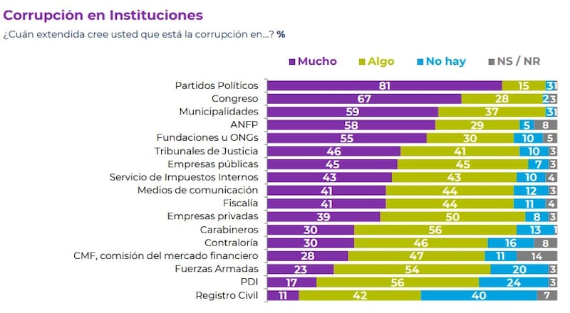 En torno a la percepción de corrupción, los encuestados piensan que este abuso de poder se extiende en a lo menos 17 instituciones del país, en distinto rango, siendo en mayor cantidad en los partidos políticos (81%), el Congreso (67%), las municipalidades (59%) y la Asociación Nacional de Fútbol Profesional ANFP (58%).