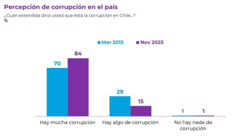 Este domingo se conocieron los resultados de la encuesta Plaza Pública, que realiza Cadem, los cuales arrojaron que un 84% de los consultados piensa que en Chile hay mucha corrupción, cifra que se eleva en 14 puntos porcentuales en los últimos ocho años, específicamente desde marzo de 2015, años en que registró por última vez.