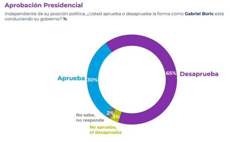 Por último, la encuesta revela que la aprobación a la gestión del Presidente Gabriel Boric cayó al 30%, mientras que su desaprobación se mantiene en 65%.