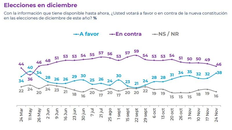 En cuanto al proceso constitucional, los porcentajes entre ambas opciones se estrechan en la cuarta semana de noviembre, alcanzando el “A favor” un 36% y el “En contra” un 46%, lo que representa la brecha más baja desde el pasado mes de mayo.