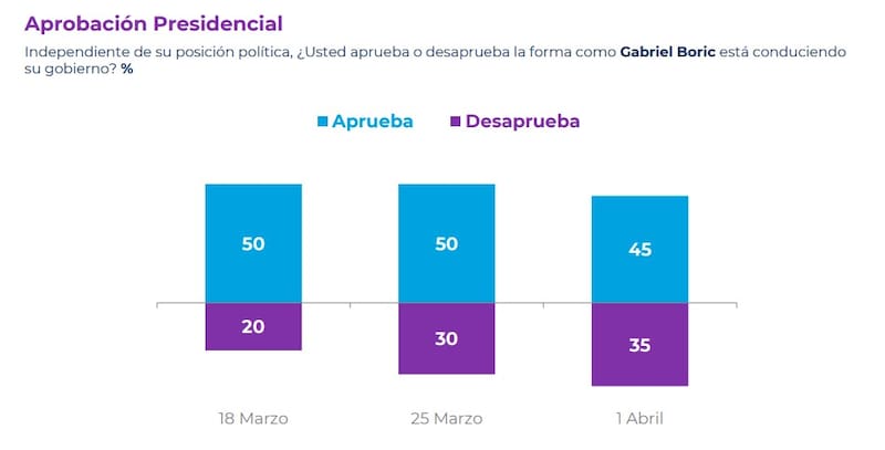 Por otra parte, la encuesta realizada entre el miércoles 30 de marzo al viernes 1 de abril, dio a conocer que la aprobación al Presidente Boric cayó 5 puntos a 45%, mientras que la desaprobación volvió a aumentar y acumula un alza de 15 en dos semanas, quedando en 35%.