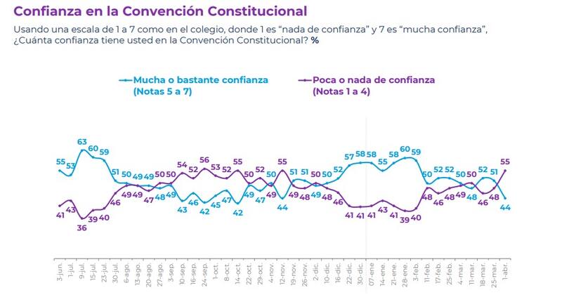 En el mismo contexto, la confianza en la Convención Constitucional bajó al 44%, evidenciando una caída de 7 puntos, mientras que la desconfianza en el organismo aumentó a 55%, lo que constituye su nivel más alto desde noviembre de 2021. En tanto, la percepción de que la Convención está logrando los acuerdos necesarios para redactar una nueva Constitución también se desplomó en 10 puntos, llegando al 42%.