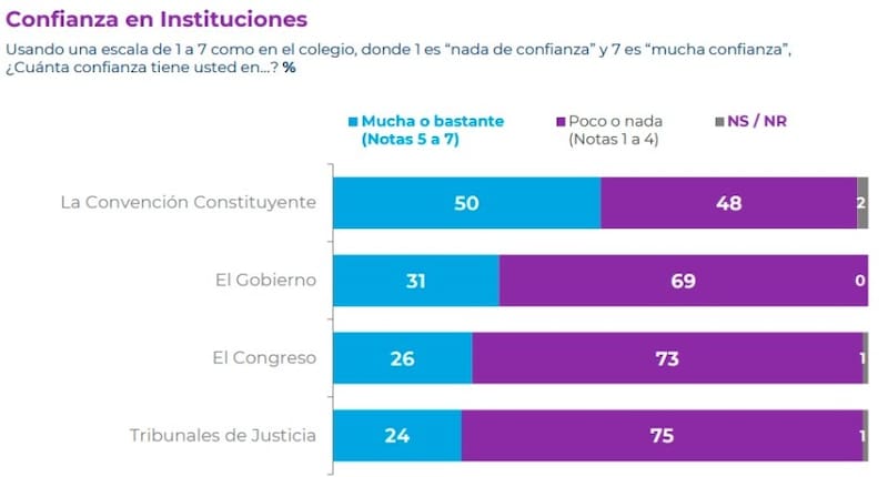 Pese a lo anterior, el órgano encargado de redactar una nueva Carta Fundamental para el país se consolida con el porcentaje de confianza la más alto entre los principales poderes del Estado. Le sigue el Gobierno con un 31%, el Congreso con un 26%, y los Tribunales de Justicia con solo un 24%.