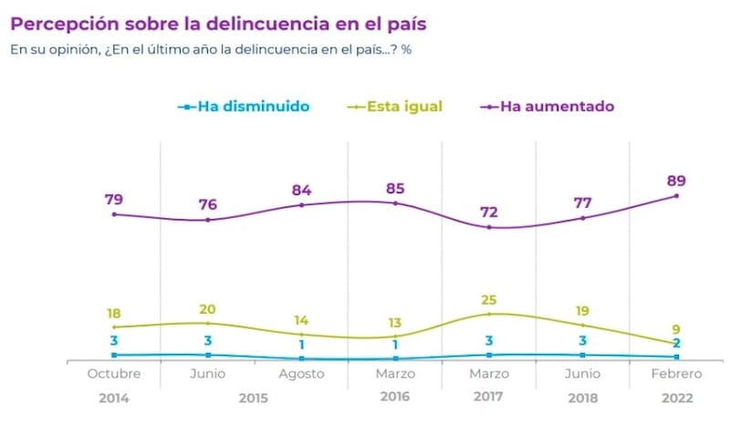 En otro ámbito, el 89% de los encuestados cree que durante el último año la delincuencia en Chile ha aumentado, alcanzando su nivel más alto desde octubre de 2014. Además, el temor a ser víctima de un delito llega a 73%, misma cifra registrada hace siete años.