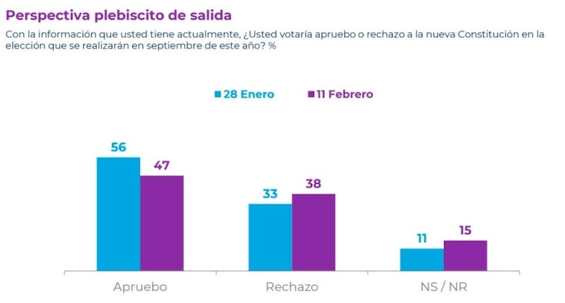 Por otra parte, la intención de aprobar la nueva Constitución cayó de 56% a 47% en los últimos 14 días, mientras que la opción de rechazo aumentó de 33% a 38%.