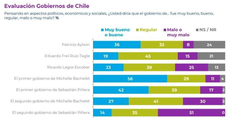 Precisamente, el primer gobierno de Bachelet se posiciona como el mejor evaluado, con un 56% de las preferencias que se inclinó por la opción bueno o muy bueno.