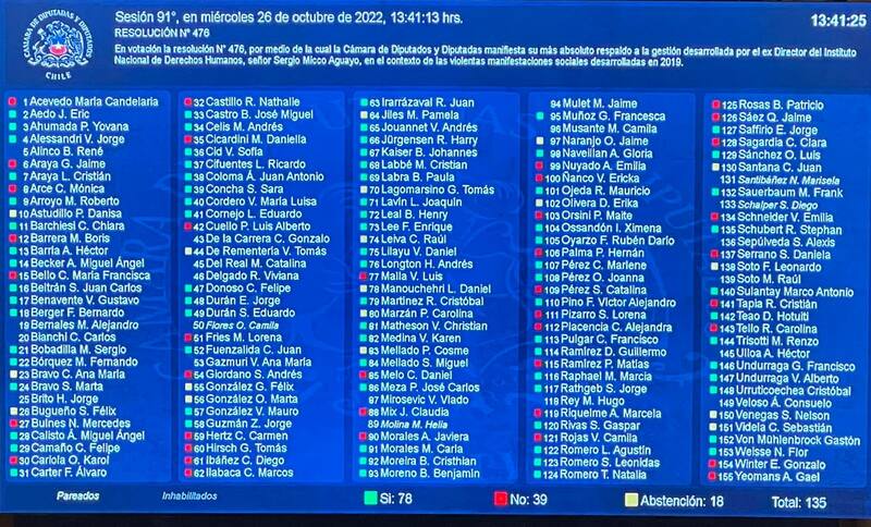 Además, el proyecto de resolución rechaza “los insultos gratuitos, inconsecuentes y parciales que recibió el Sr. Micco durante el ejercicio de su cargo, por ejemplo de parte de la actual diputada del Partido Comunista, Doña Carmen Hertz”, quien había señalado anteriormente que “nombraron a Sergio Micco precisamente por ese perfil, muy ignorante en materia de Derechos Humanos”.