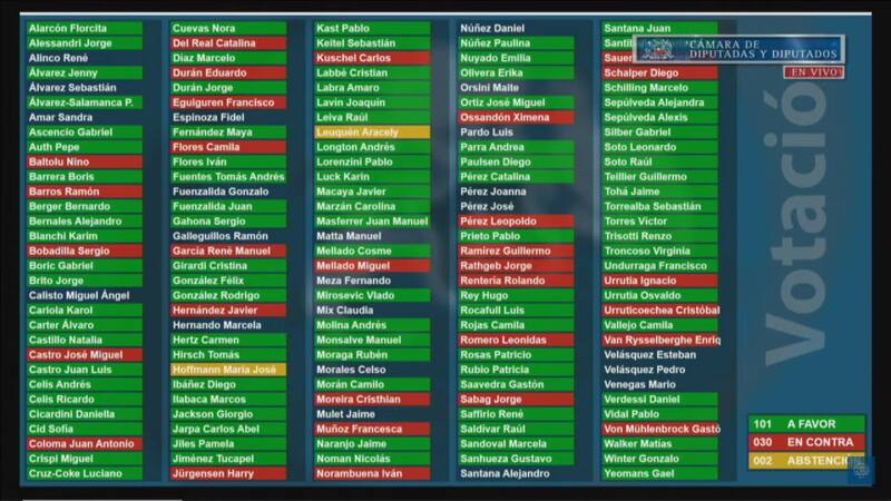 En detalle, las dos abstenciones corresponden a las diputadas María José Hoffmann (UDI) y Aracely Leuquén (RN). Mientras que, dentro del rechazo a la iniciativa, se encuentra Miguel Mellado (RN), Leopoldo Pérez (RN), Ximena Ossandón (RN), Guillermo Ramírez (UDI) y Juan Antonio Coloma (UDI).
