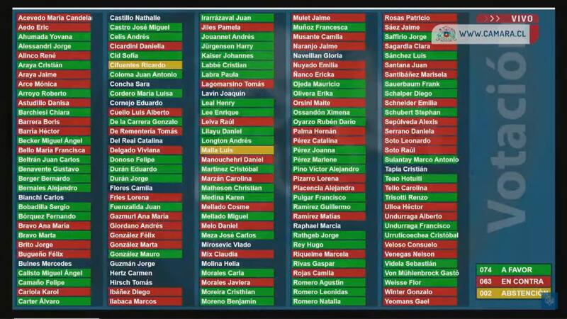 La iniciativa contó con 74 votos a favor, 63 en contra y 2 abstenciones. En el oficialismo, los diputados del Partido Liberal, Alejandro Bernales votó favorablemente el proyecto; también Sebastián Videla, independiente pro PL. Luis Malla, militante del partido, se abstuvo.