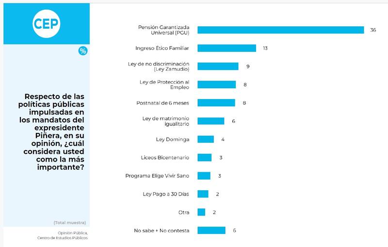 Respecto de las políticas públicas impulsadas en los mandatos de Piñera, el 36% de los encuestados consideró como la más importante a la Pensión Garantizada Universal (PGU), un 13% destacó el Ingreso Ético Familiar y un 9% la Ley de No Discriminación (Ley Zamudio).