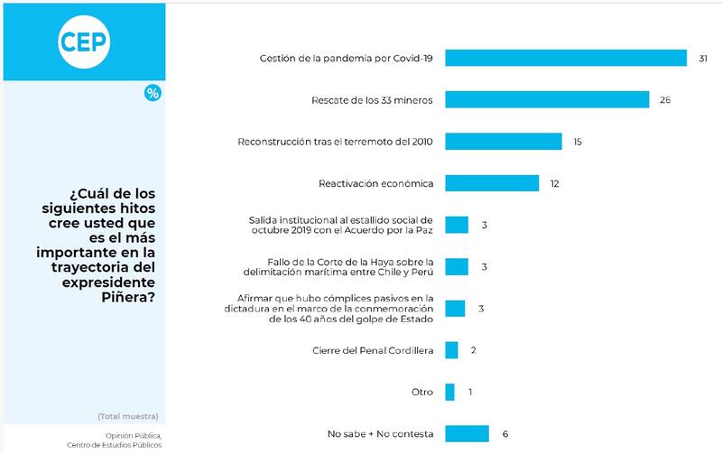 Ante la pregunta: ¿Cuál de los siguientes hitos cree usted que es el más importante en la trayectoria del expresidente Piñera? La mayoría de los encuestados consideró que fue la “Gestión de la Pandemia por Covid-19″, opción elegida por el 31% de los participantes del estudio.