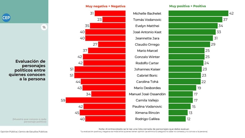 A la par, esta el diputado y abanderado del Partido Nacional Libertario, Johannes Kaiser, quien también presenta una baja en la aprobación de 9 puntos porcentuales. Sin embargo, tiene una alza de ocho puntos en su evaluación negativa.