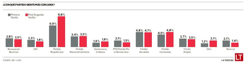 En el sondeo del CNEP antes de los comicios, la pregunta “¿con qué partido siente más cercanía?” ubicó en primer lugar al Partido Republicano, con 6,9% de las preferencias. Esta cifra aumentó a 9,8% cuando se proclamó a José Antonio Kast como ganador de la segunda vuelta. Aunque el Partido Comunista registró una variación entre ambos periodos (4% a 4,8%), los investigadores no estimaron relevante su variación.