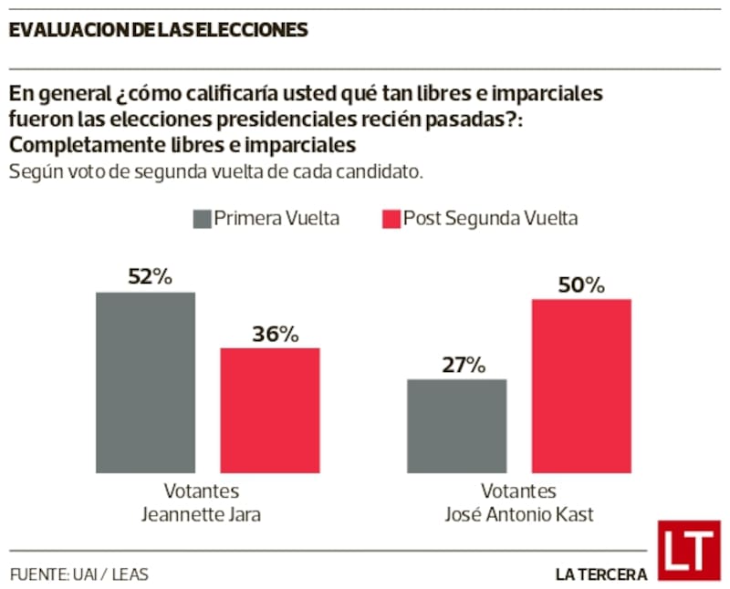 En la pregunta sobre qué tan imparcial fue la primera vuelta, el 52% de los votantes de Jara lo consideró de esa manera, en tanto que el electorado de Kast le otorgó un 27%. En la segunda vuelta, estos porcentajes se invirtieron: los partidarios de Jara la calificaron así en un 36% y los de Kast con un 50%.