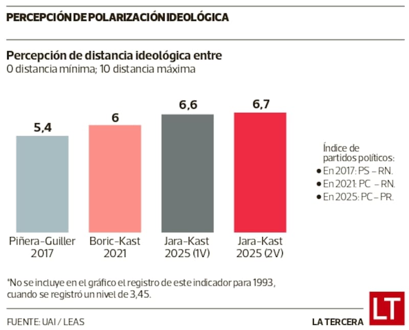 Para calcular la polarización afectiva, los participantes evaluaron qué tan favorable o desfavorable les parecen los candidatos en una escala de 1 a 10. En 2021, esta operación arrojó un 3,9 en las elecciones de Gabriel Boric y José Antonio Kast. En noviembre de 2025, la dicotomía Jeanette Jara y Kast obtuvo un 6,34, lo que simbolizó un aumento de 62,5% de la polarización en el país.