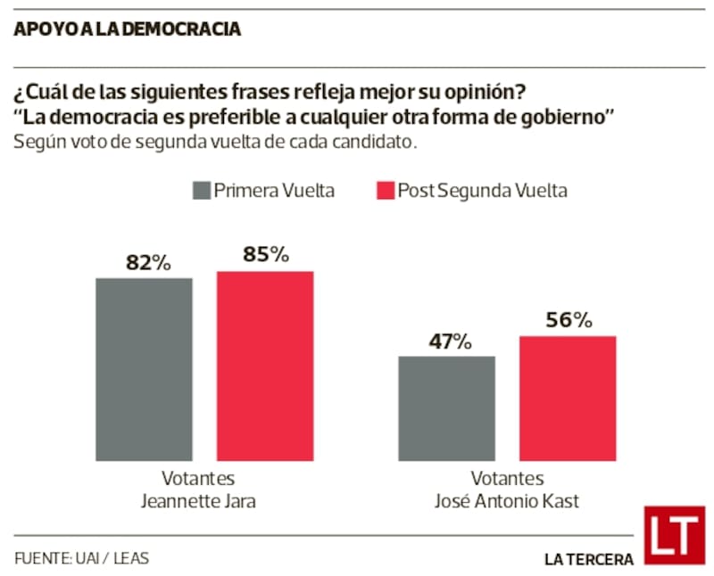 En otro punto de la encuesta CNEP, se solicitó a los encuestados que escogieran la frase que más los representan. “La democracia es la mejor forma de gobierno” obtuvo un 47% de las preferencias del electorado de Kast antes de las elecciones, y 82% en el de Jara. En el sondeo posterior a los comicios, la frase se hizo más popular entre los votantes del Presidente electo al recibir el 56% de las preferencias. En el caso de la carta comunista subió a 85%.
