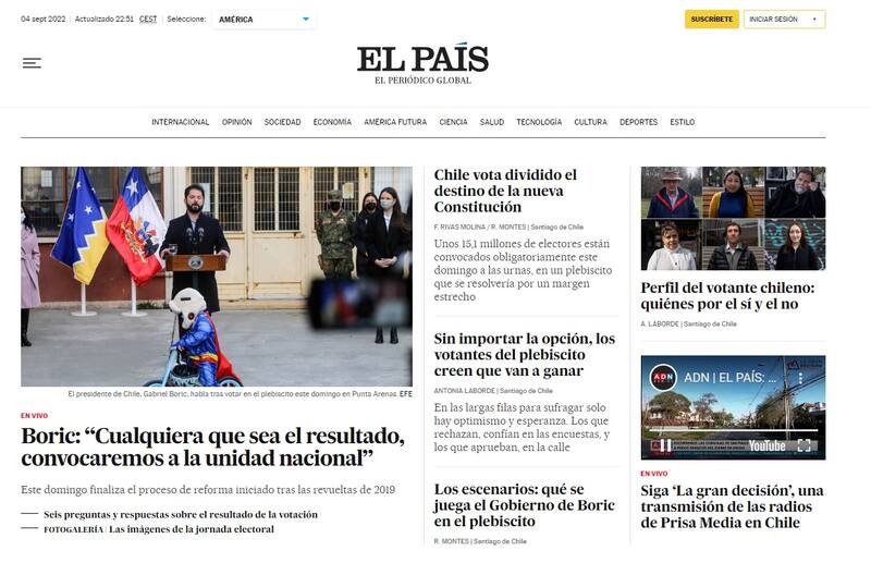 “Chile vota dividido el destino de la nueva Constitución”, dice el título de una de las nota que el diario El País de España publicó hoy sobre el plebiscito de salida chileno. En su sitio global tiene una amplia cobertura además, con información actualizada de la jornada electoral y una nota con una de las declaraciones del Presidente Gabriel Boric este domingo.