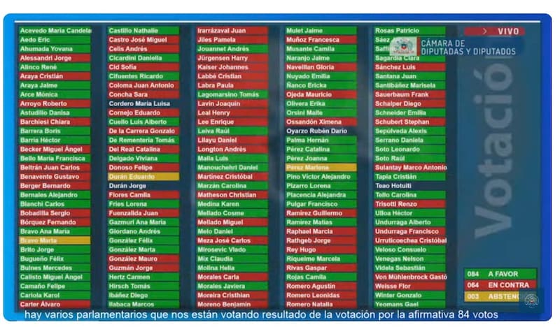 Los tres que se abstuvieron fueron: el diputado de Renovación Nacional Eduardo Durán y las diputadas de la bancada de la Unión Demócrata Independiente (UDI) Marta Bravo y Marlene Pérez.