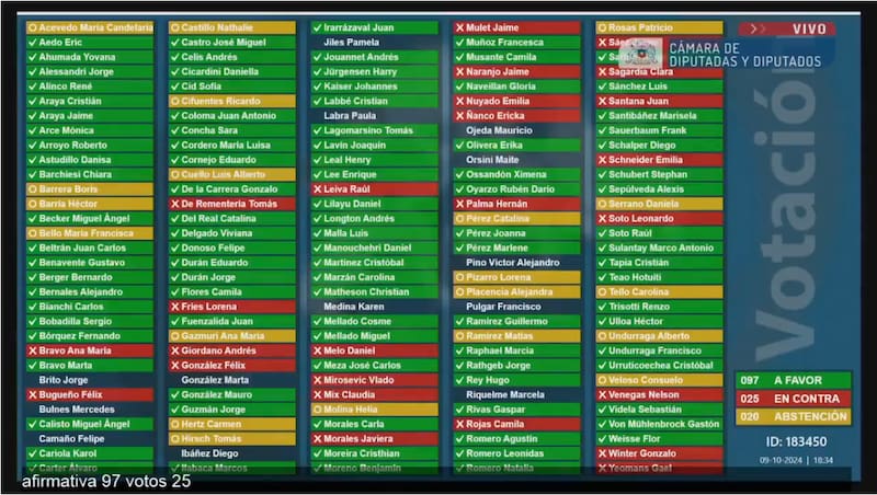 En cuanto a las abstenciones, 9 de los parlamentarios que optaron por esta opción son del Partido Comunista, cinco del Frente Amplio y tres de la Democracia Cristiana.