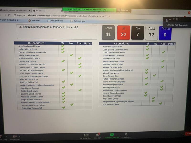 En los 41 votos consignados se materializó el rechazo por parte de los senadores José Miguel Durana, Pedro Araya, Alejandro García Huidobro, José Miguel Insulza, Jorge Pizarro, Jorge Soria, Jacqueline van Rysselberghe.