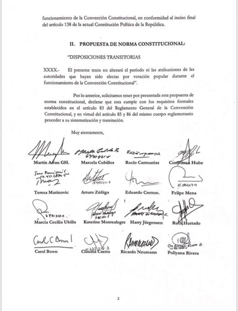 Con la firma de 16 constituyentes, entre ellos, Marcela Cubillos, Teresa Marinovic, Harry Jurgensen, Ruth Hurtado, Constanza Hube, Arturo Zúñiga y Martin Arrau; la disposición transitoria estipula que la propuesta de nueva Constitución “no alterará el periodo ni las potestades de las autoridades que hayan sido electas por votación popular durante el funcionamiento de la Convención".
