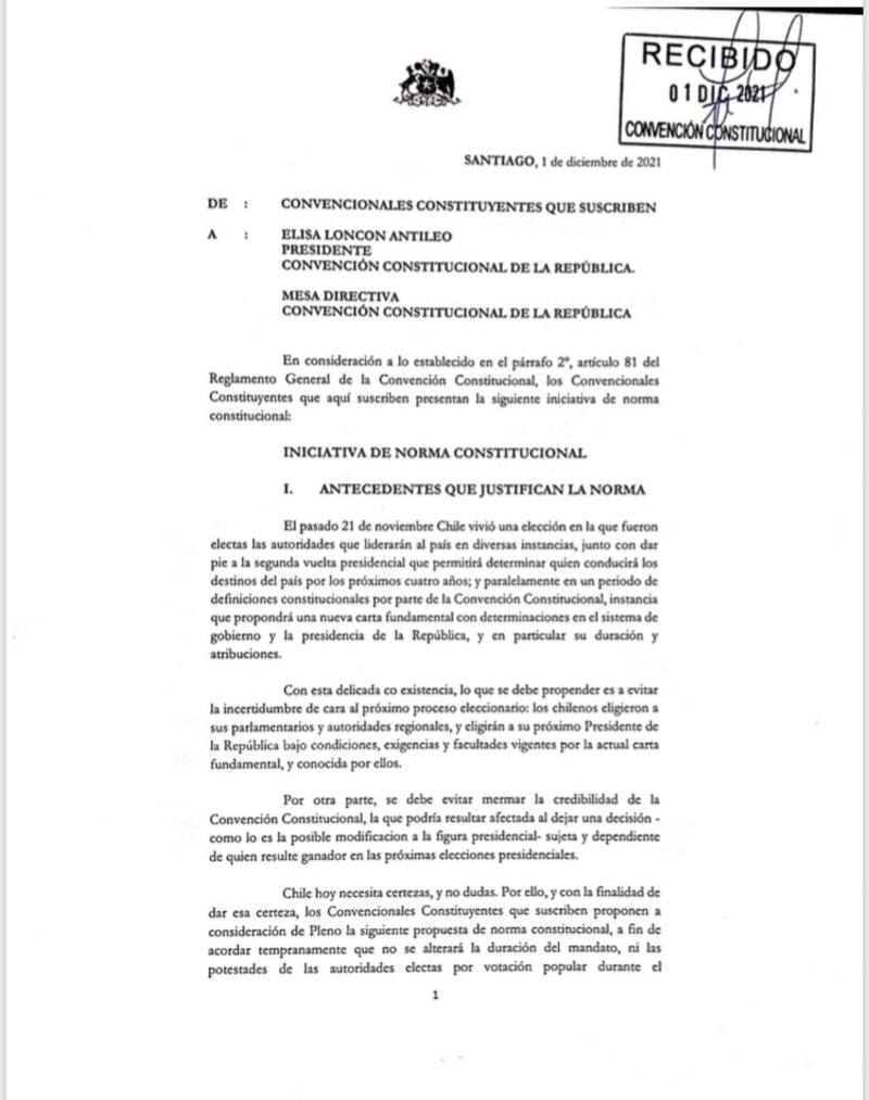De acuerdo al escrito, la propuesta de Carta Magna “no alterará el periodo ni las potestades de las autoridades que hayan sido electas por votación popular durante el funcionamiento de la Convención Constitucional. (...) Se debe evitar mermar la credibilidad de la Convención, la que podría resultar afectada al dejar una decisión -como lo es la posible modificación de la figura presidencial- sujeta y dependiente de quien resulte ganador en la próximas elecciones”.