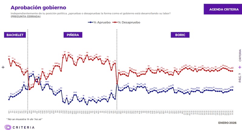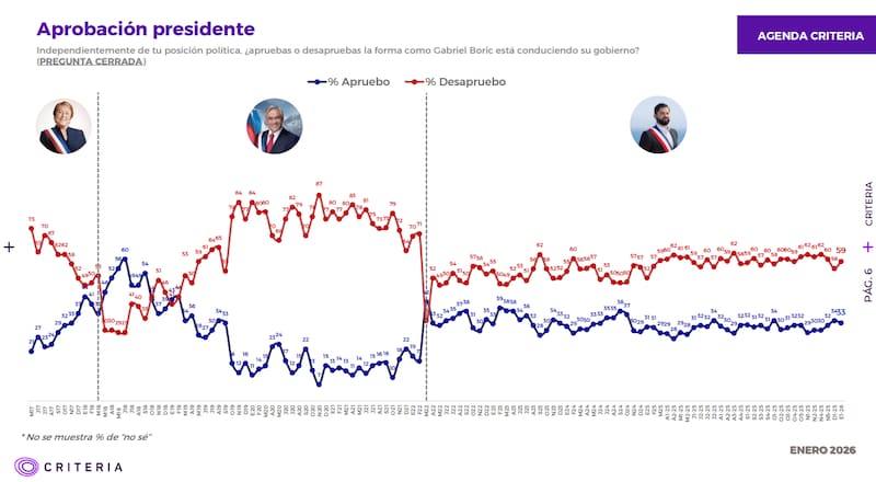 En la encuesta, que recopiló respuestas entre el 6 y 8 de enero a través de un panel online, la aprobación al mandato del Presidente Gabriel Boric sufrió un leve descenso de un punto respecto a la medición de diciembre de 2025 y registró un 33%.