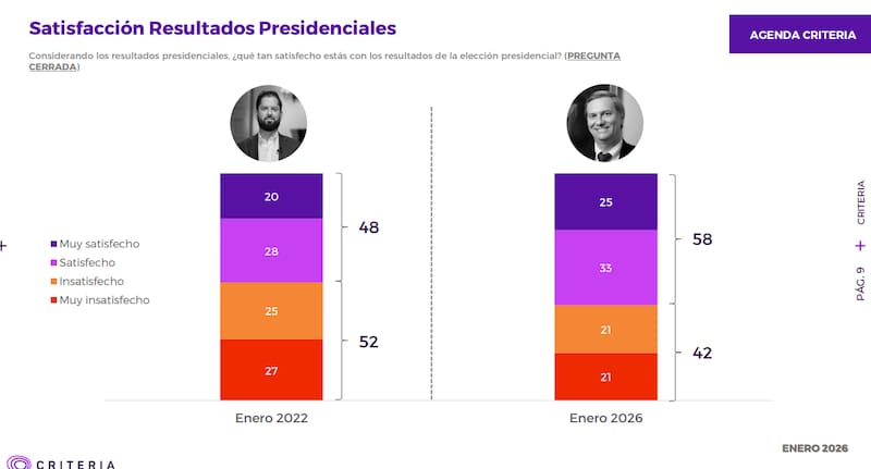 Para enero de 2026, y frente a la misma consulta, un 58% de los encuestados señaló estar satisfecho o muy satisfecho con la elección de Kast.