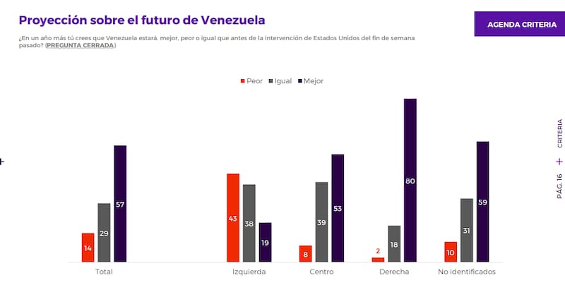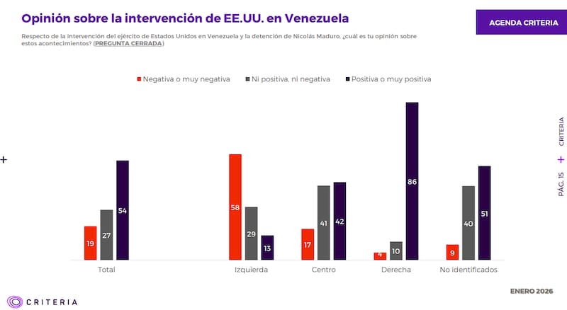 La medición de este 11 de enero también tuvo una apartado para evaluar la recepción a la intervención militar estadounidense en Venezuela, que el pasado 3 de enero realizó un ataque aéreo a distintas ciudades y capturó durante la madrugada al exmandatario Nicolás Maduro y a su esposa, Cilia Flores.