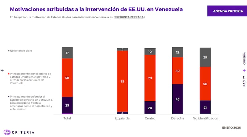 Mientras tanto, solo un 25% piensa que la incursión militar tuvo como objetivo defender el Estado de derecho en Venezuela, para protegerse frente a amenazas como el narcotráfico y el terrorismo.
