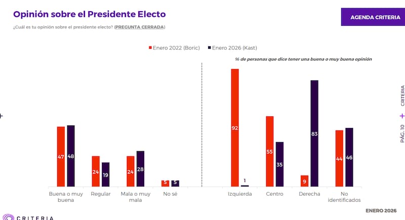 Un 47% de los encuestados en enero de 2022 señaló tener una opinión buena o muy buena de Boric, mientras que ahora en 2026 un 48% la tuvo sobre José Antonio Kast.