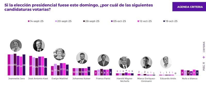 La mañana de este domingo 19 de octubre, Criteria publicó los resultados de su última encuesta, la que mostró un alza de la carta oficialista Jeannette Jara (PC) en el primer lugar, además de los descensos de las candidaturas opositoras José Antonio Kast (P. Rep) y Evelyn Matthei (UDI).
