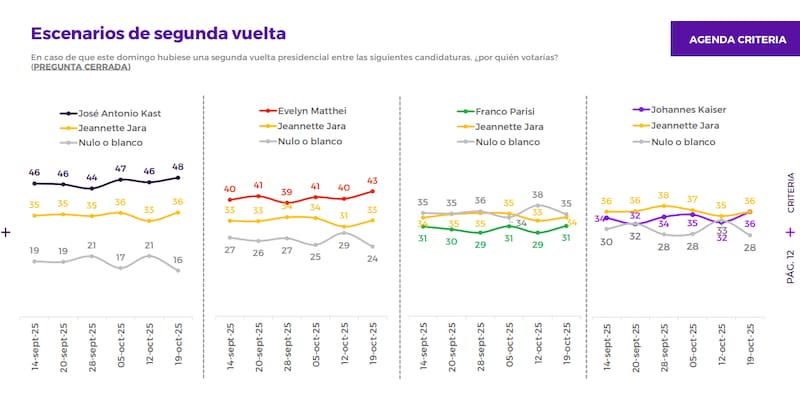 En los escenarios de segunda vuelta, en una confrontación entre José Antonio Kast y Jeannette Jara la medición registró que triunfaría la carta del Partido Republicano con 48% (+2) de las preferencias sobre el 36% (+3) de Jara y el 16% (-5) de los nulos y blancos.
