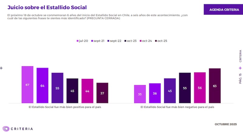 En su medición de este año, la percepción positiva sobre el estallido social bajó a un 37% de las opiniones, siete puntos menos respecto al año pasado (que registró un 44%). En tanto, las opiniones negativas sobre el evento subieron de un 56% a un 63%.