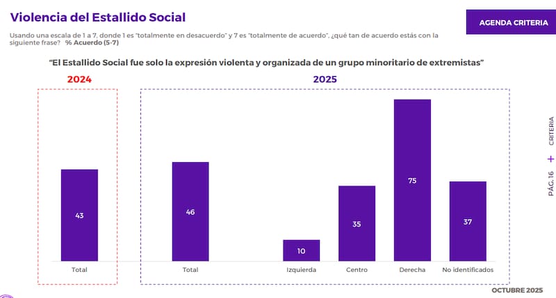 La encuesta también consultó respecto a la visión de la violencia durante el estallido social. Respecto a la frase "El Estallido Social fue solo la expresión violenta y organizada de un grupo minoritario de extremistas", un 46% de los consultados se mostró de acuerdo.