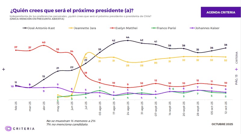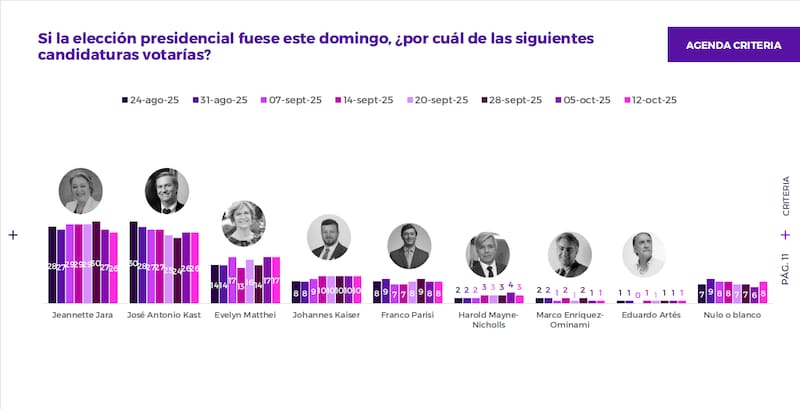 Este domingo 12 de octubre se dieron a conocer los resultados de la última encuesta Criteria. Según las cifras entregadas por el instrumento de medición, los candidatos José Antonio Kast (Republicano) y Jeannette Jara (PC) estarían empatados en el primer lugar tras un leve descenso en el apoyo a la carta oficialista.