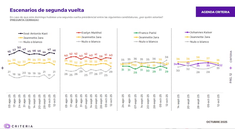La medición de Criteria también evaluó una serie de escenarios eventuales para la segunda vuelta. En ese sentido, en un enfrentamiento entre José Antonio Kast y Jeannette Jara, el primero registraría un 46% (-1) de las preferencias contra un 33% (-3) de la carta oficialista. Un 21% (+4) señala que marcaría nulo o blanco.